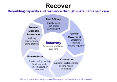 Ongoing recovery practices support long-term wellbeing, resilience, and burnout prevention, helping people move away from “pushing through” towards sustainable ways of working.